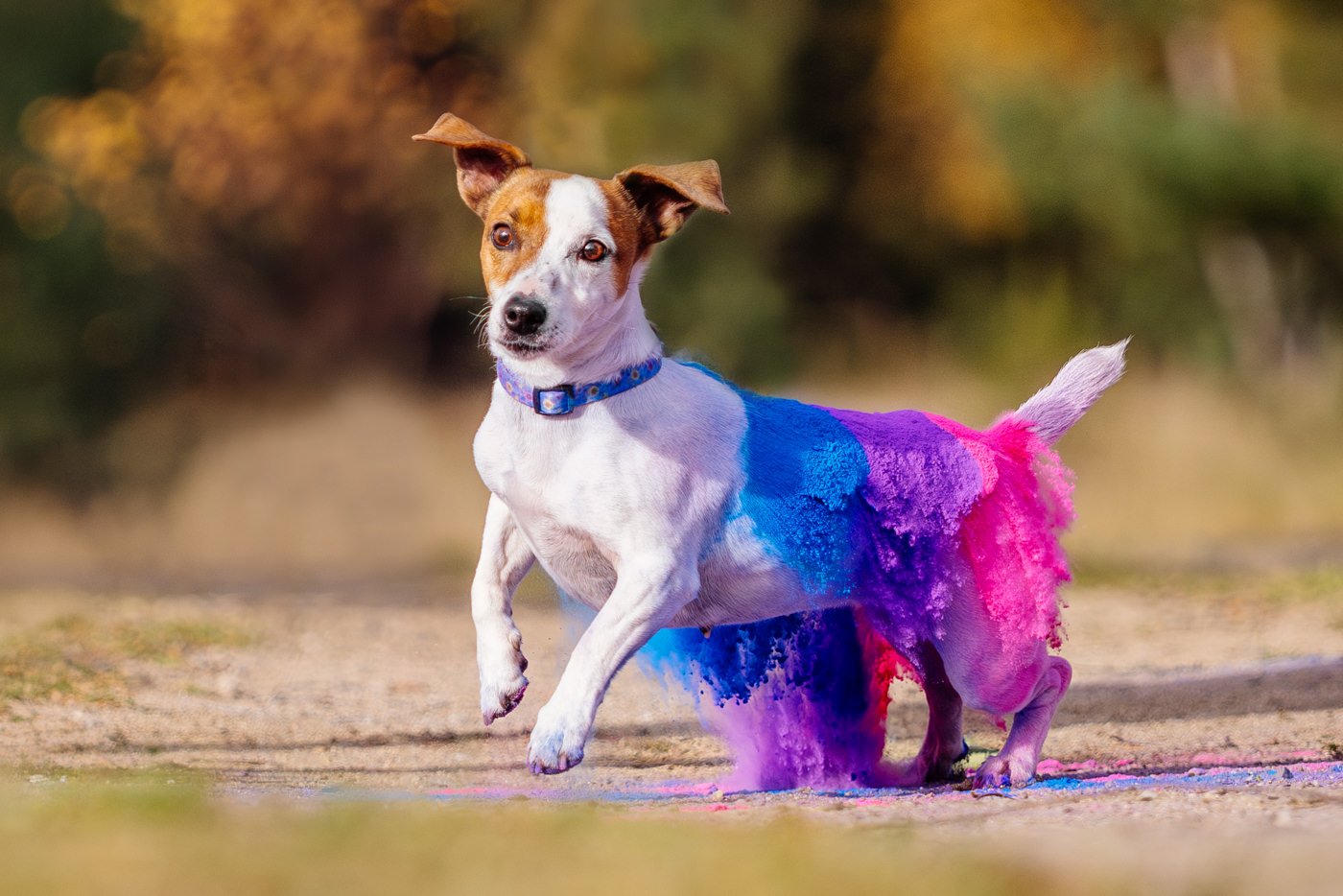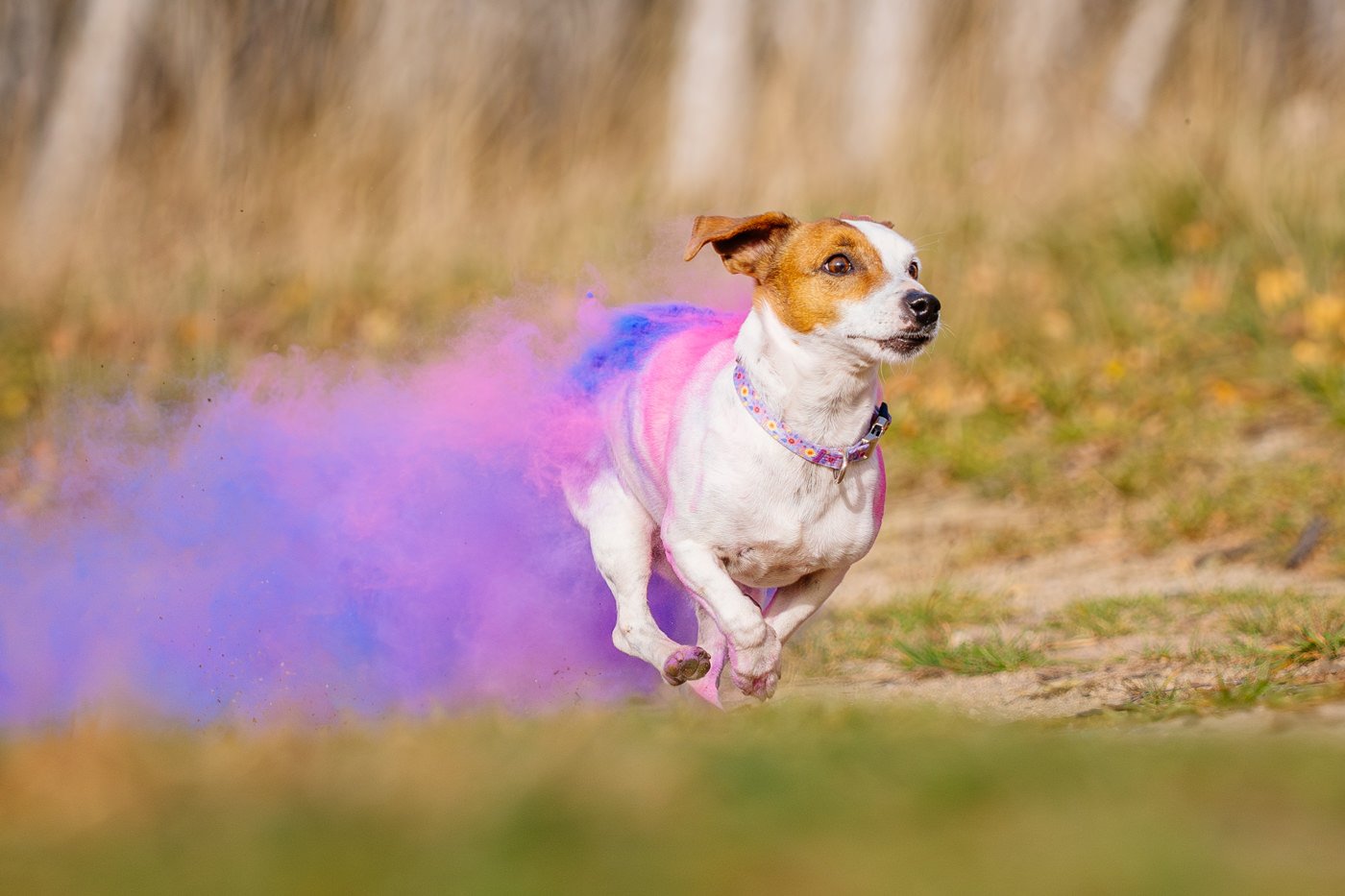 Der Herbst bringt ja von Natur aus schon unglaublich viele Farben mit sich: goldene Blätter, warmes Licht und überall dieses typische Herbstleuchten. Aber bei einem Hund Kunterbunt Shooting darf es am Ende ruhig noch ein bisschen bunter werden! Deshalb kamen zum Abschluss unseres Shootings auch die Holi Farben zum Einsatz.