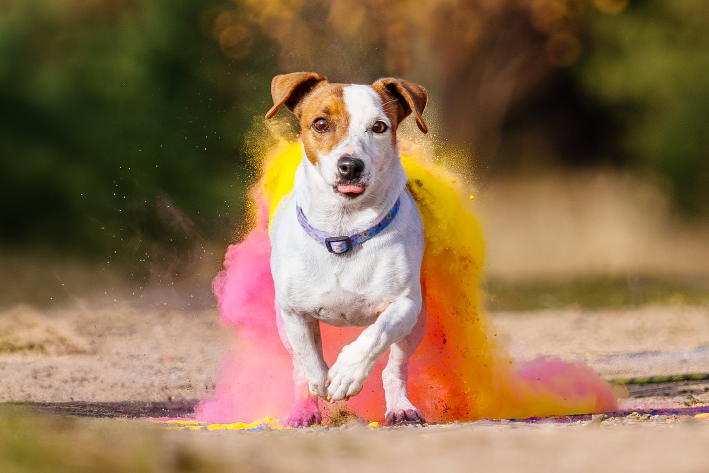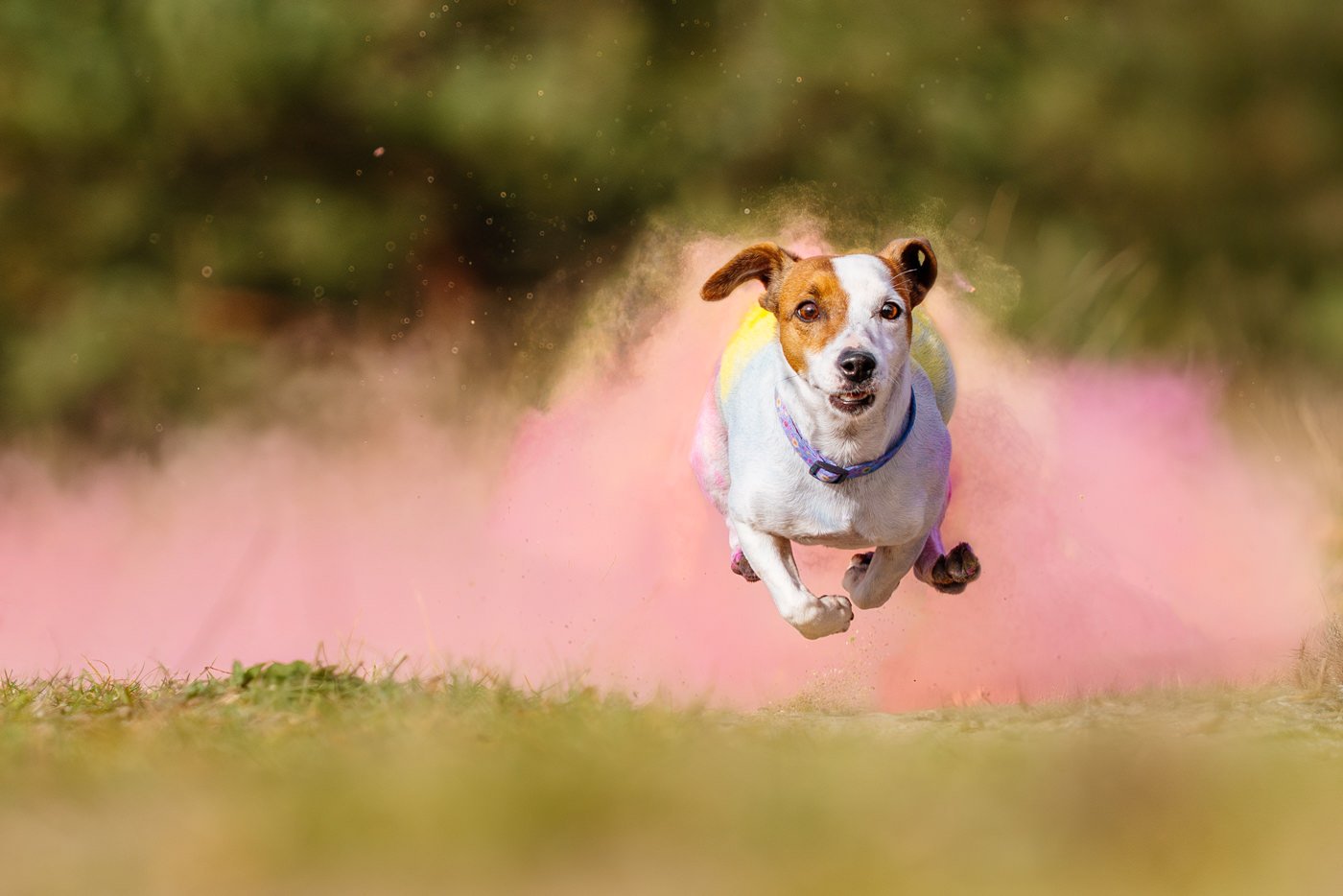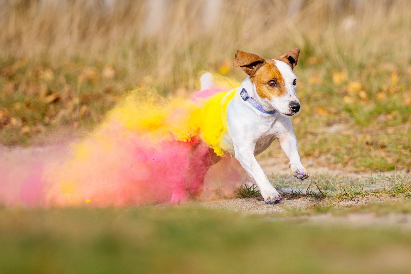 Frauchen hielt Betti ruhig bei sich und trug das Pulver auf, dann rief Herrchen sie. Und Betti? Die fand das Ganze offensichtlich ziemlich großartig. Sie rannte los – und hinter ihr entstand eine wunderschöne Farbexplosion.