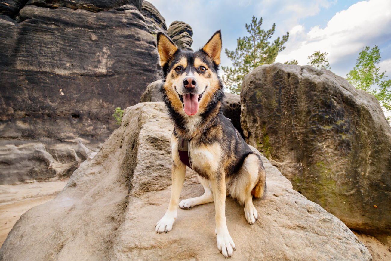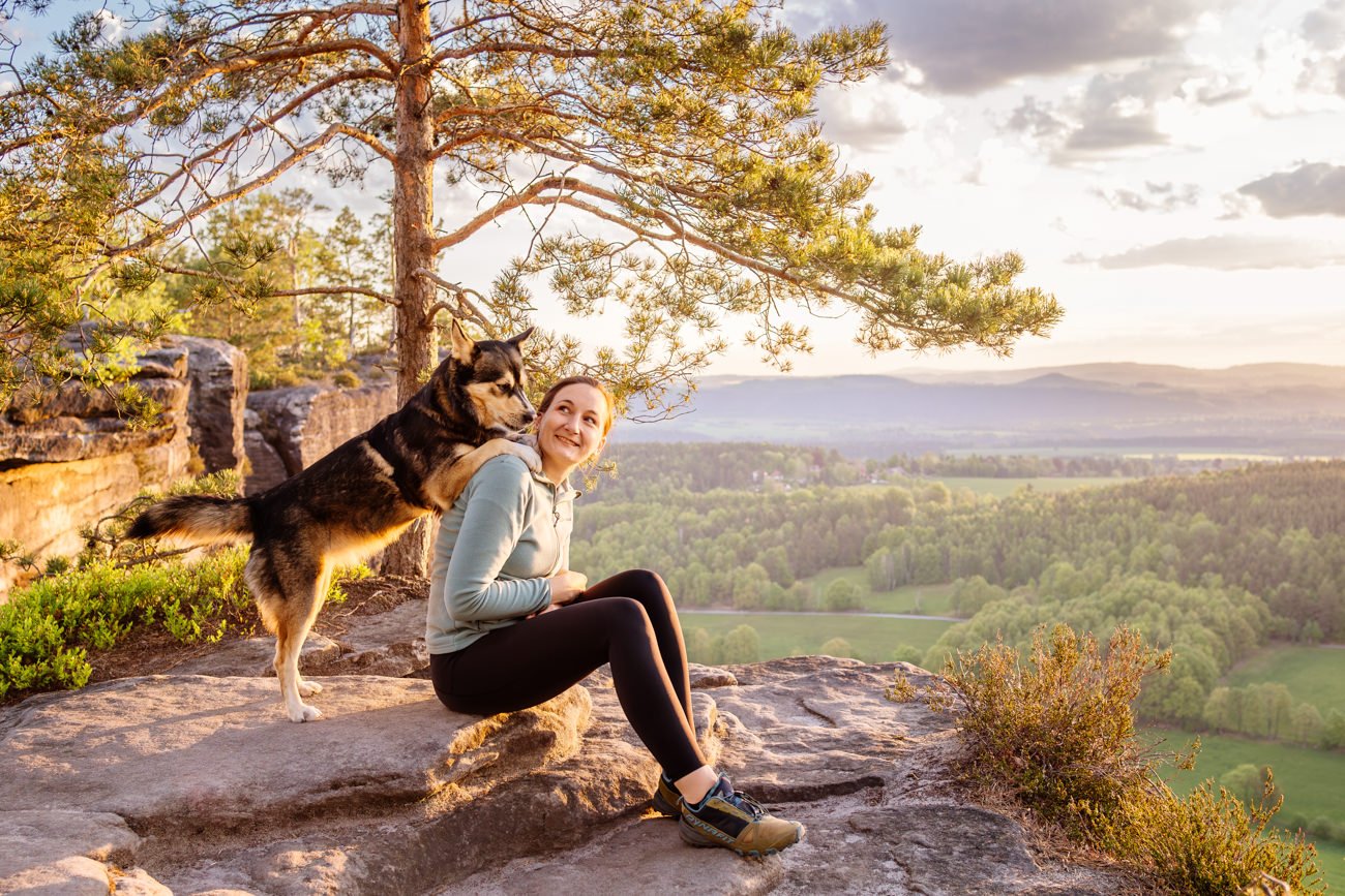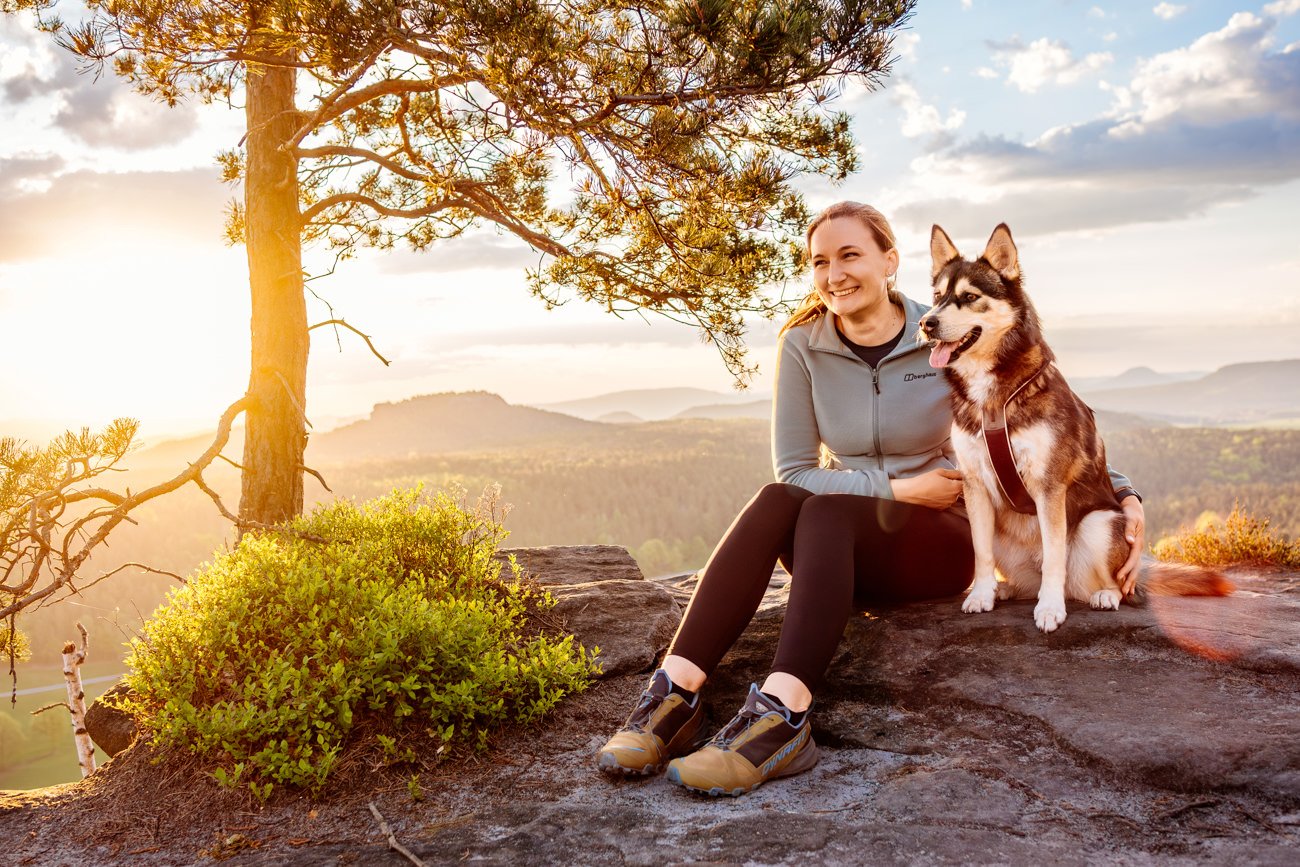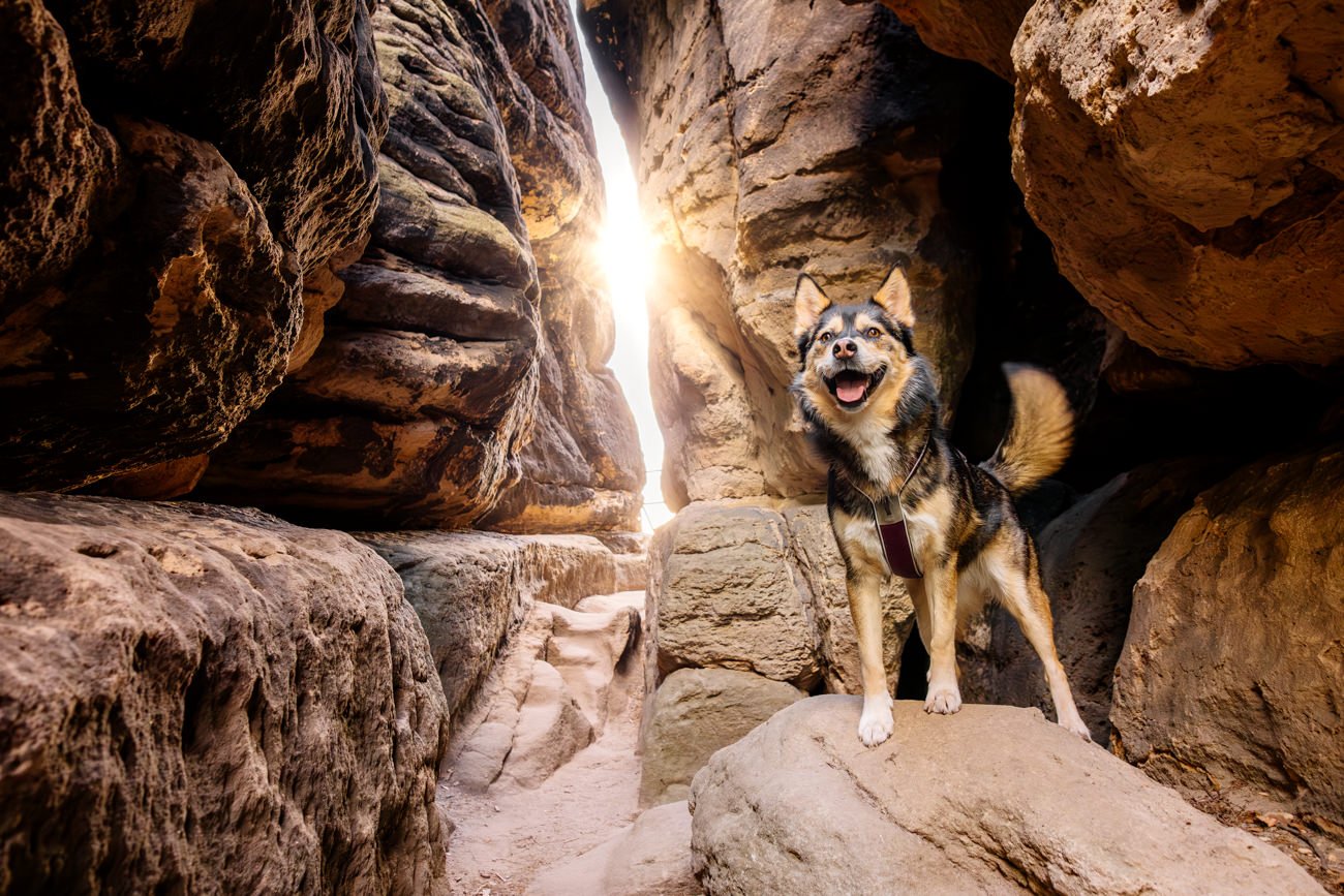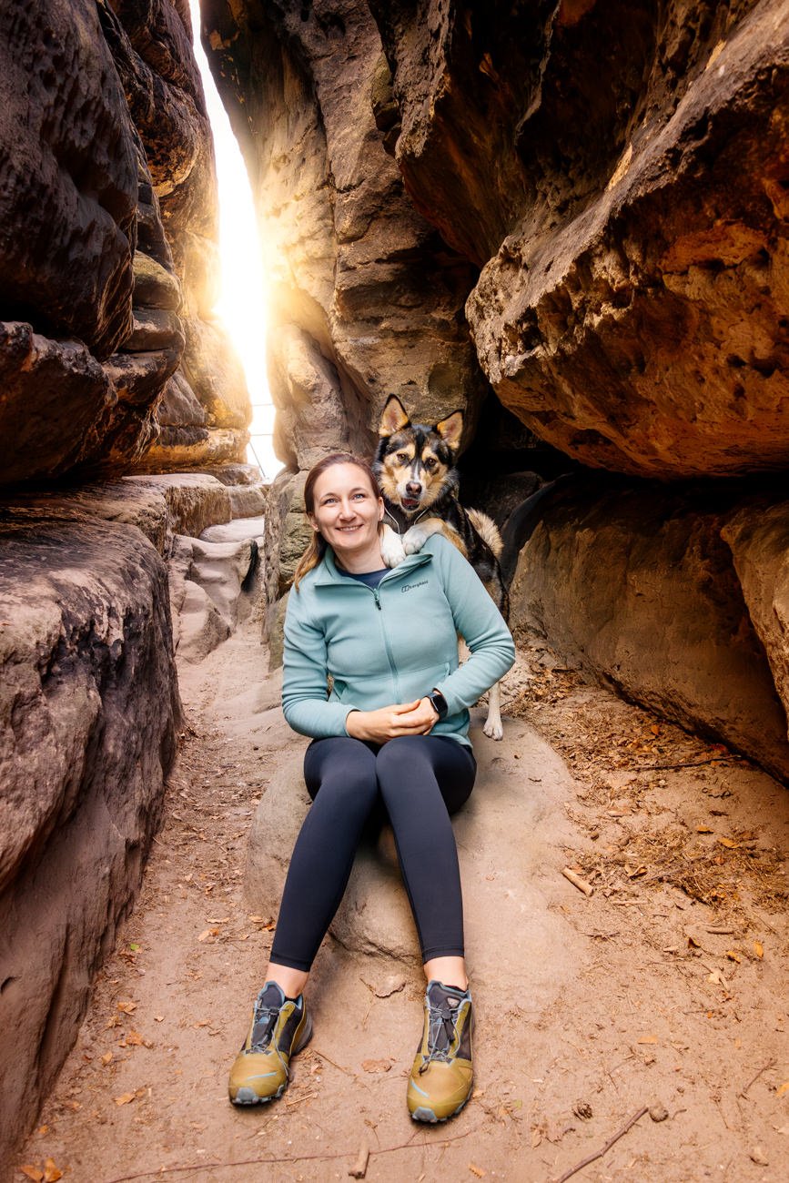 Nachdem die Sonne bereits höher stand, wanderten wir weiter zu einem beeindruckenden Felsplateau. Dort entstanden weitere Fotos mit der wundervollen Huskymischlings-Dame Tala und ihrem Frauchen – unter anderem in einer vom Sonnenlicht durchfluteten Felsspalte, die fast ein wenig an den Kings Canyon erinnerte. Ein Ort, wie gemacht für Abenteuer Fotos mit Hund.