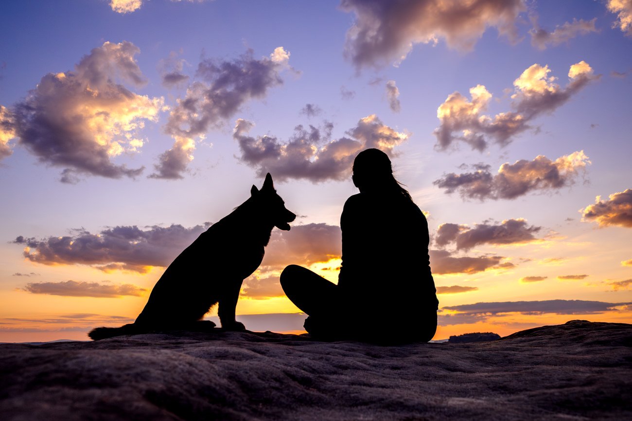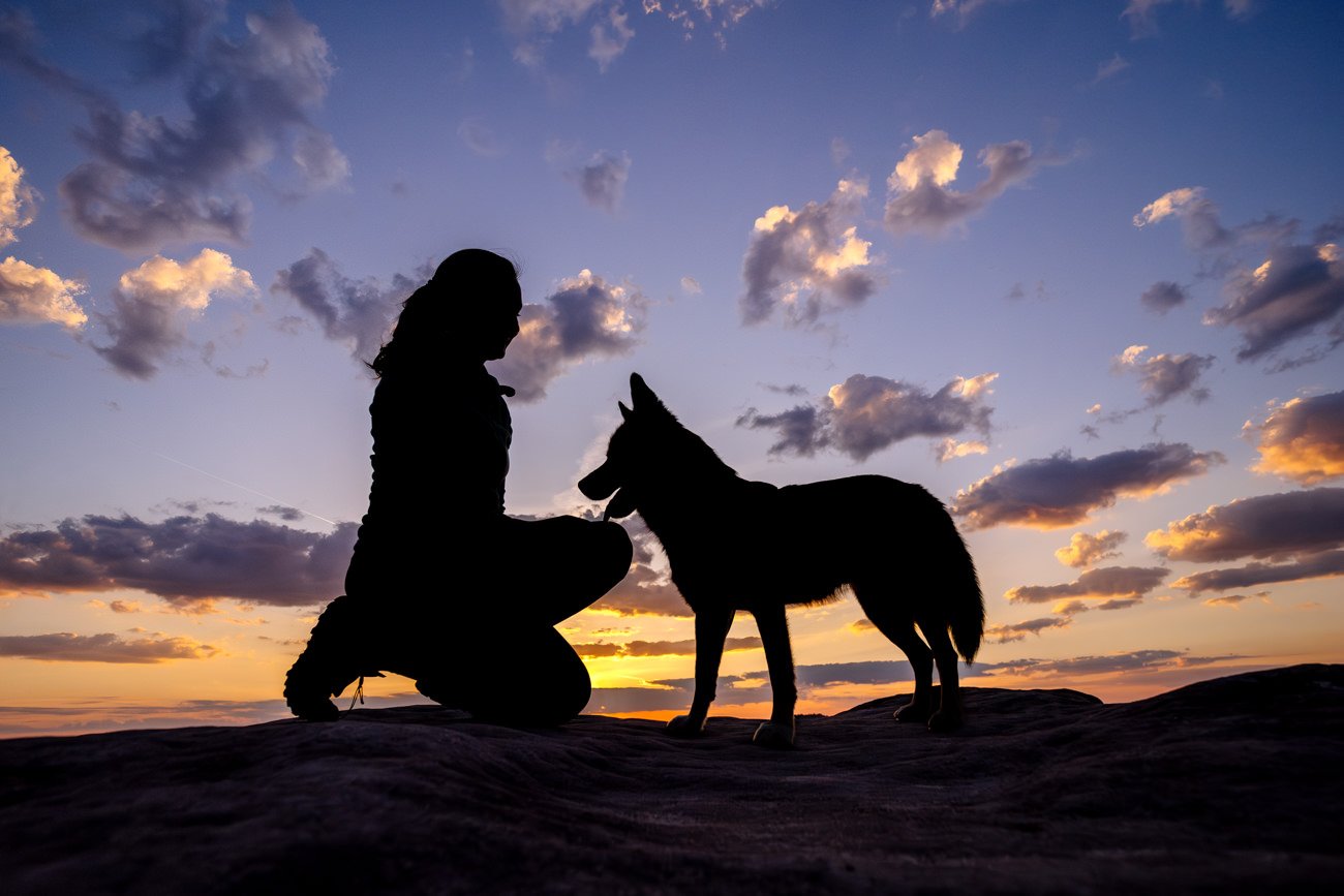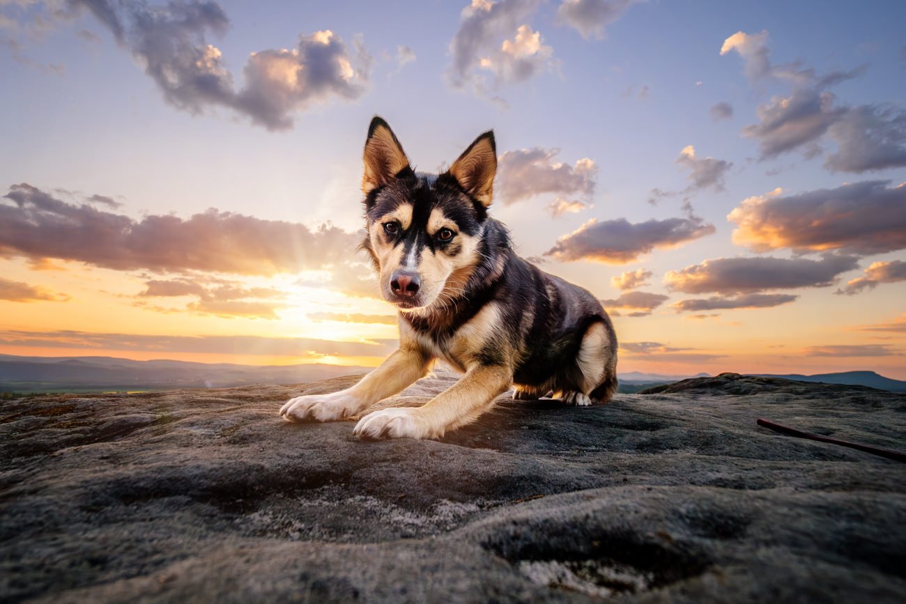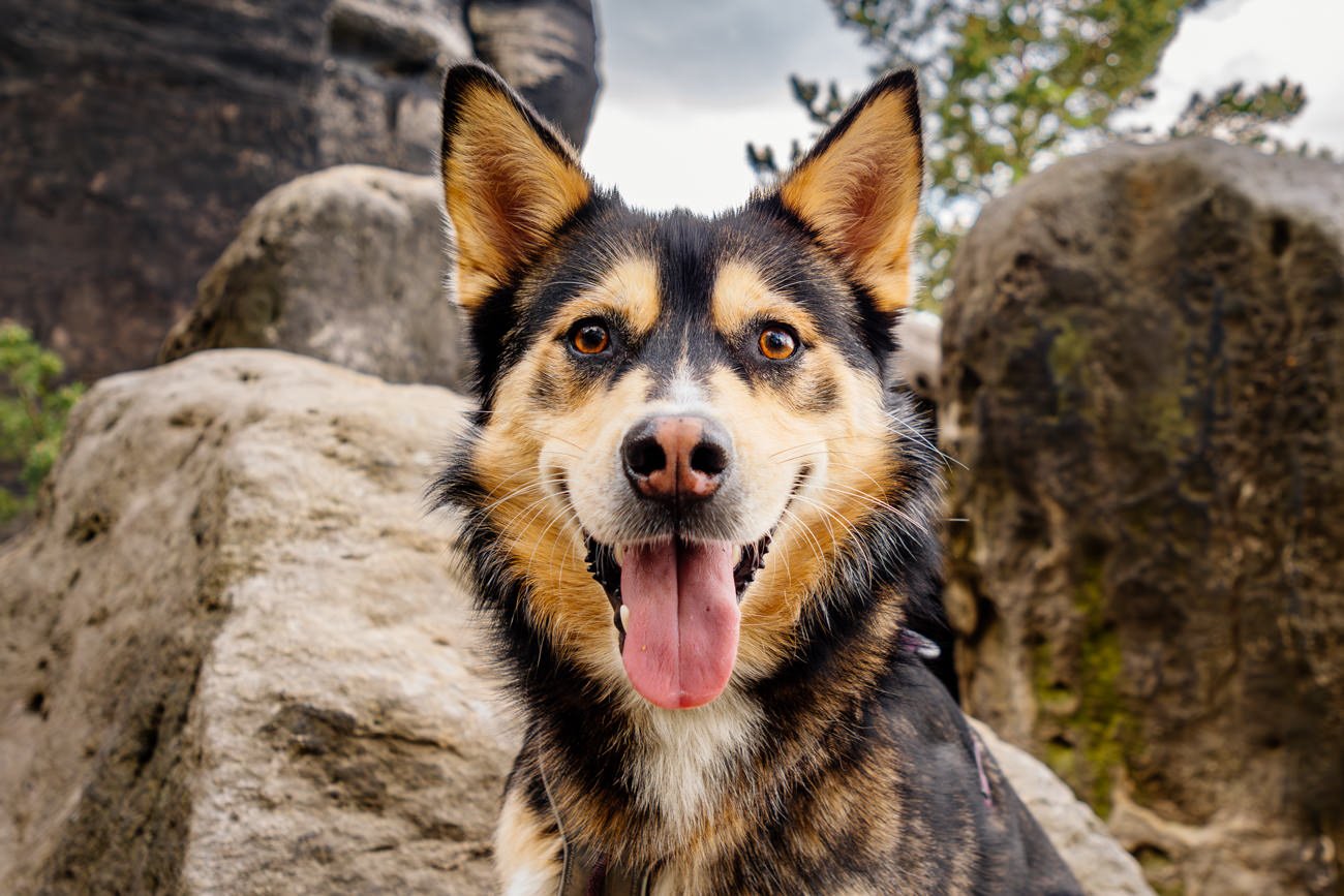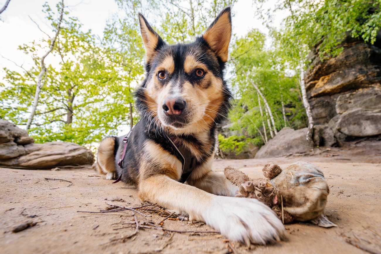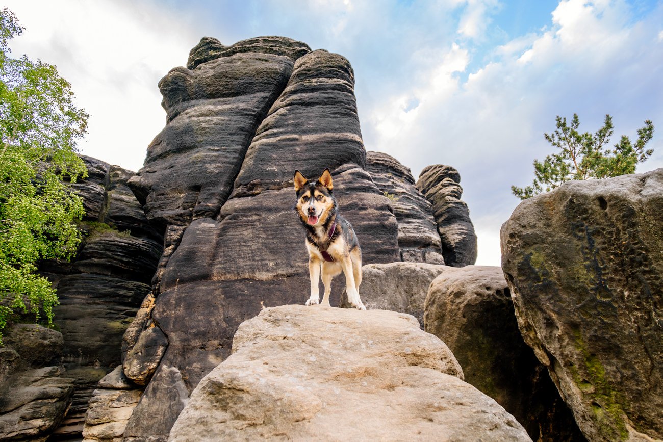 Nachdem die Sonne bereits höher stand, wanderten wir weiter zu einem beeindruckenden Felsplateau. Dort entstanden weitere Fotos mit der wundervollen Huskymischlings-Dame Tala und ihrem Frauchen – unter anderem in einer vom Sonnenlicht durchfluteten Felsspalte, die fast ein wenig an den Kings Canyon erinnerte. Ein Ort, wie gemacht für Abenteuer Fotos mit Hund.