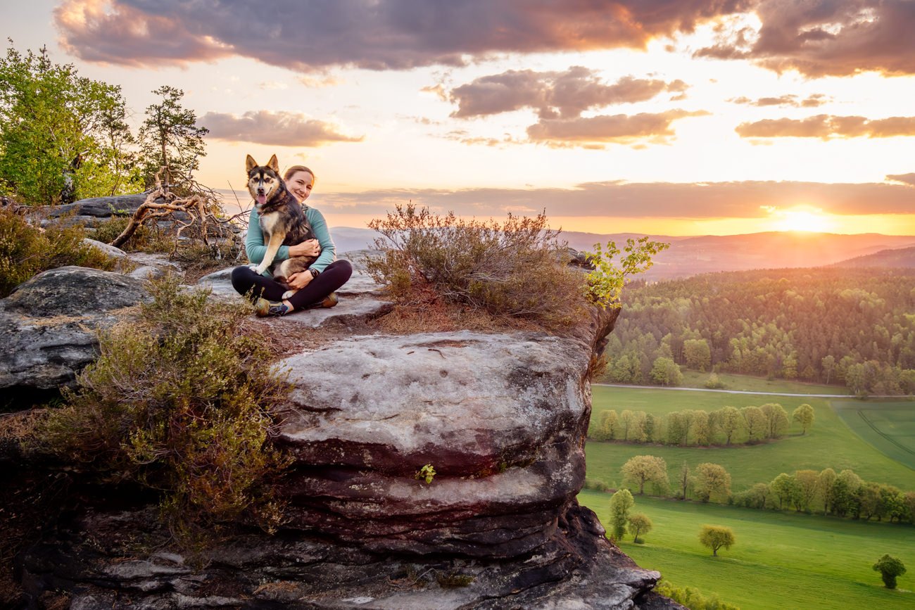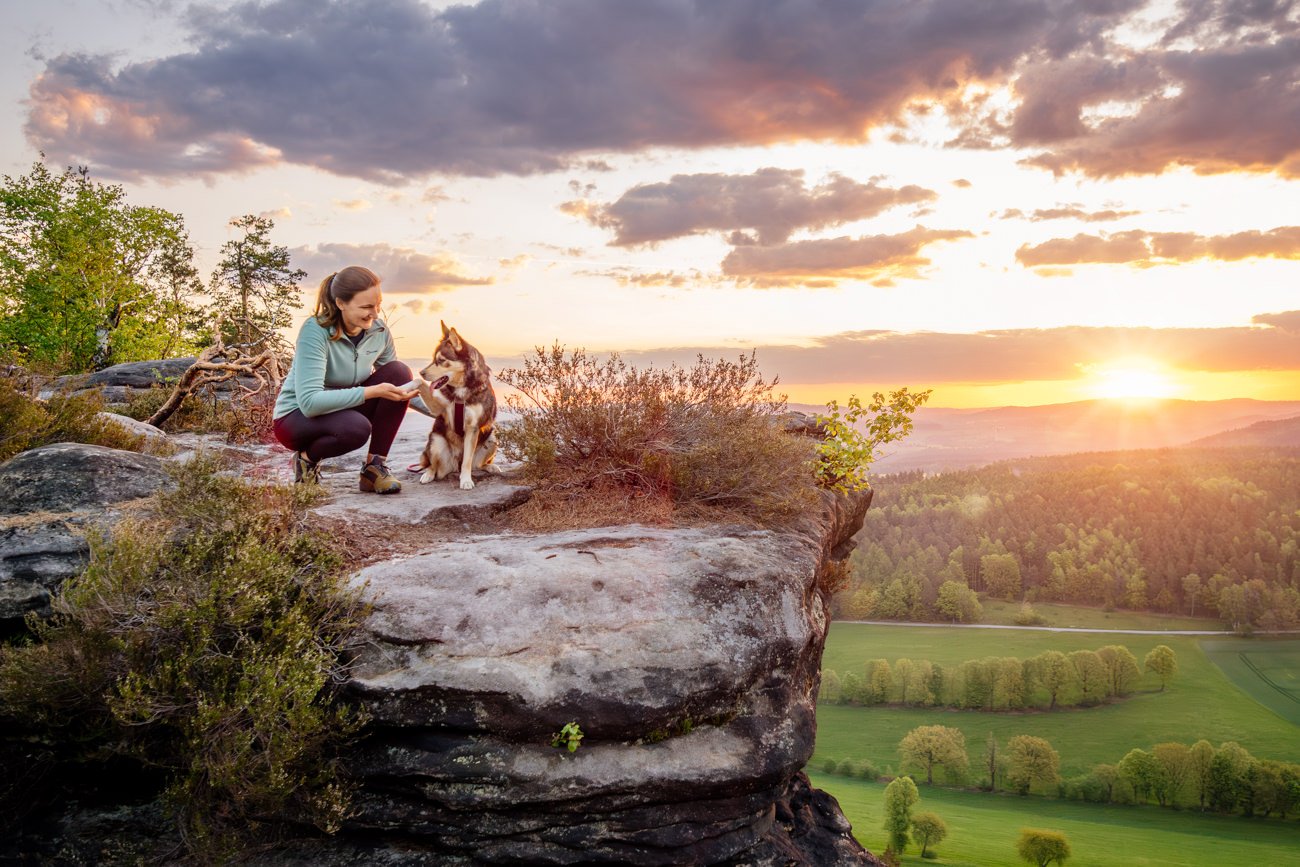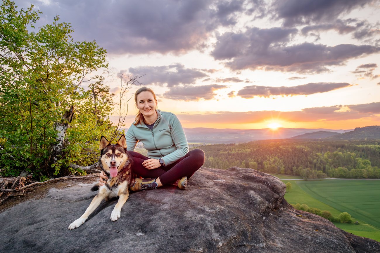 Also schnappte ich mir meinen Kram, stieg zu Stefanie ins Auto und wir fuhren zurück zum Treffpunkt. Von dort ging es im absoluten Eiltempo hinauf auf den Gipfel. Zu sagen, dass es knapp war, wäre eine Untertreibung – als wir oben ankamen, schob sich die Sonne gerade über den Horizont. Stefanie und Tala konnten den Sonnenaufgang in der Sächsischen Schweiz gerade noch so, aber mehr als verdient, genießen. Und ich? Ich war einfach nur mega happy darüber, das wir es noch rechtzeitig geschafft hatten und ich die beiden in diesen wundervollen Momenten einfangen konnte!