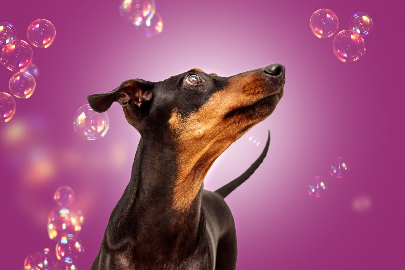 Deshalb gibt es meine Gute-Laune-Fotosession, in der ich dir lustige Bilder von deinem Hund vor bunten Hintergründen zauber.